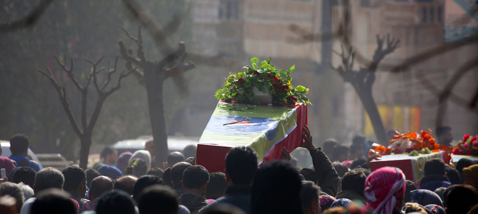Syrische Kurden nehmen an einer Beerdigung für Kämpfer der kurdischen Miliz YPG in Afrin teil. Bild: AFP