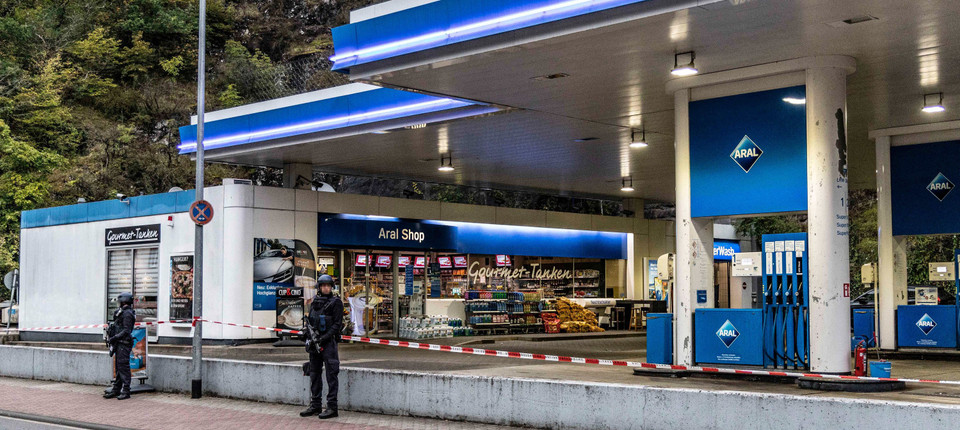 Am Morgen nach der Tat sicherten Polizisten die Tankstelle, deren Kassierer erschossen worden war. Bild: dpa