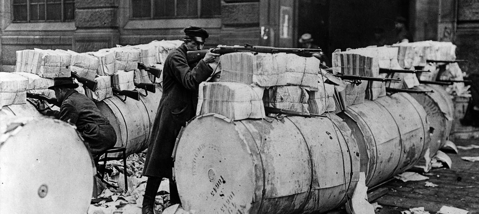 Auch die Lügenpresse ist für etwas gut: Spartakisten sichern 1919 im Berliner Zeitungsviertel ihre Barrikaden aus Zeitungen und Papierrollen. Bild: Ullstein