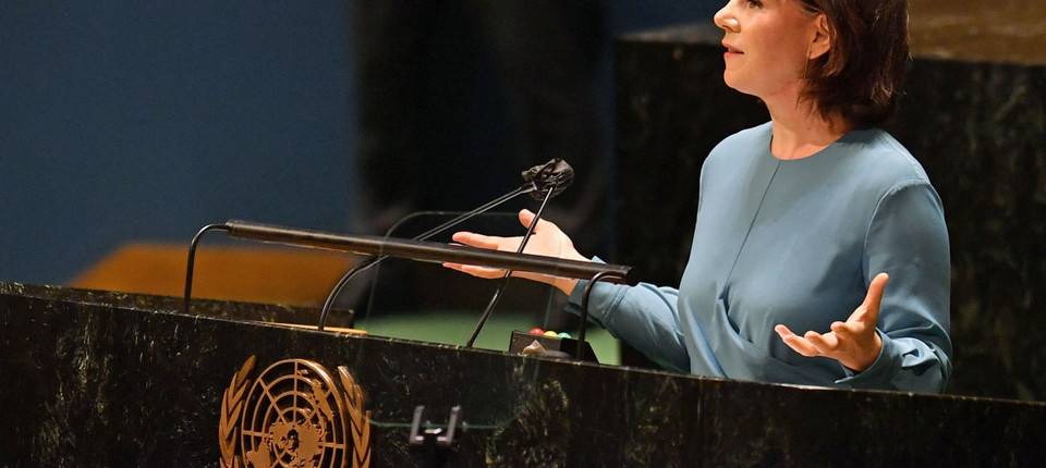 Hebt Schicksale des Krieges hervor: Außenministerin Baerbock vor der UN-Vollversammlung Bild: AFP