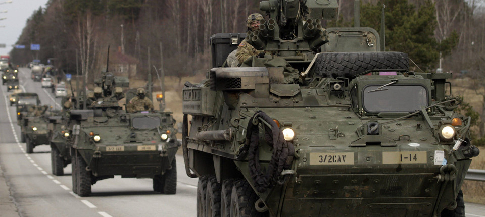 Auf dem Weg nach Ansbach: Amerikanische Stryker-Radpanzer unterwegs in Litauen, aufgenommen am 22. März. Bild: dpa