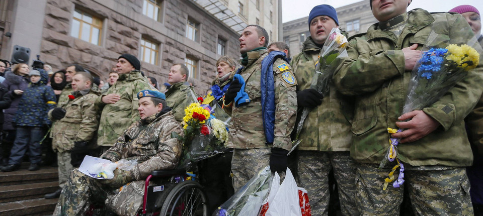 Soldaten des 12. ukrainischen Freiwilligen-Bataillons singen nach ihrer Rückkehr von der Front am Tag der Armee am 6. Dezember in Kiew die Nationalhymne. Bild: dpa