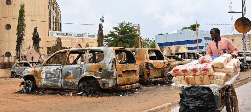 Ein Straßenhändler passiert in Niamey ausgebrannte Autos. Bild: AFP