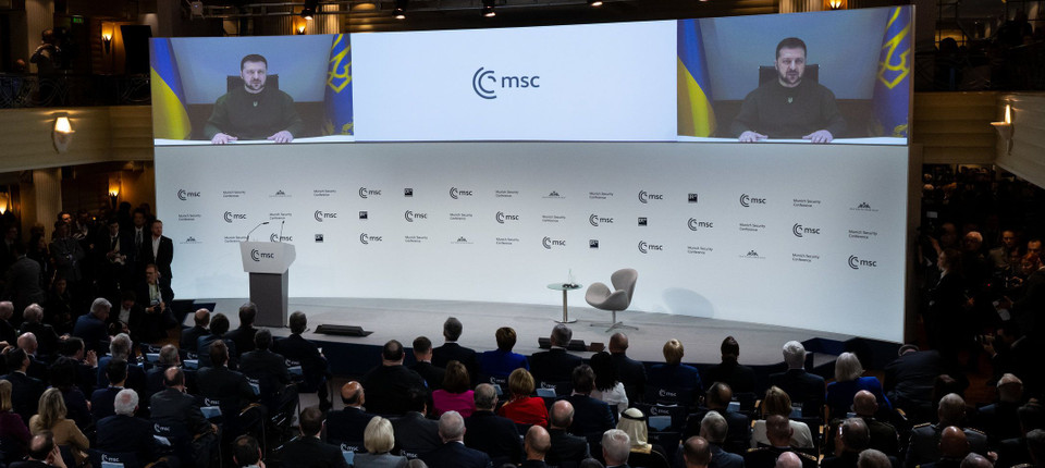 Wolodymyr Selenskyj nimmt per Videoschalte an der Sicherheitskonferenz teil. Bild: Sven Hoppe/dpa