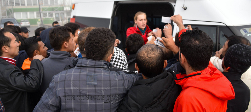 Nach der Massenschlägerei: Flüchtlinge stehen vor dem Zeltlager im hessischen Kassel-Calden für eine Transportmöglichkeit zur Röntgenuntersuchung an. Bild: dpa