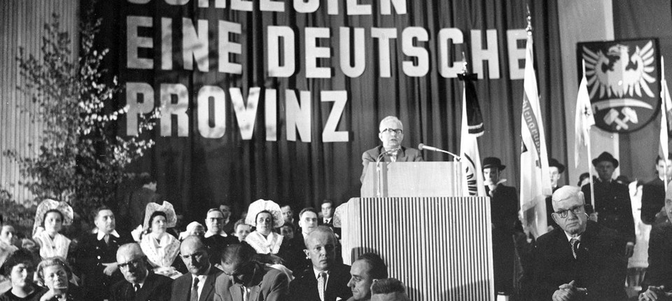 April 1960: Der Präsident des Bundes der Vertriebenen, Hans Krüger, auf dem Treffen der Landsmannschaft der Schlesier in Bonn Bild: UPI