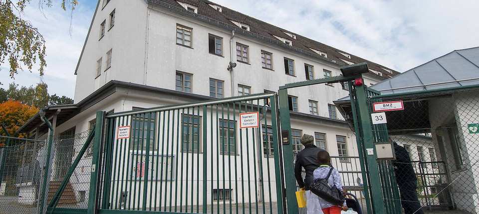 Zwei Personen stehen vor dem Ankerzentrum im bayrischen Deggendorf. (Archivfoto) Bild: dpa