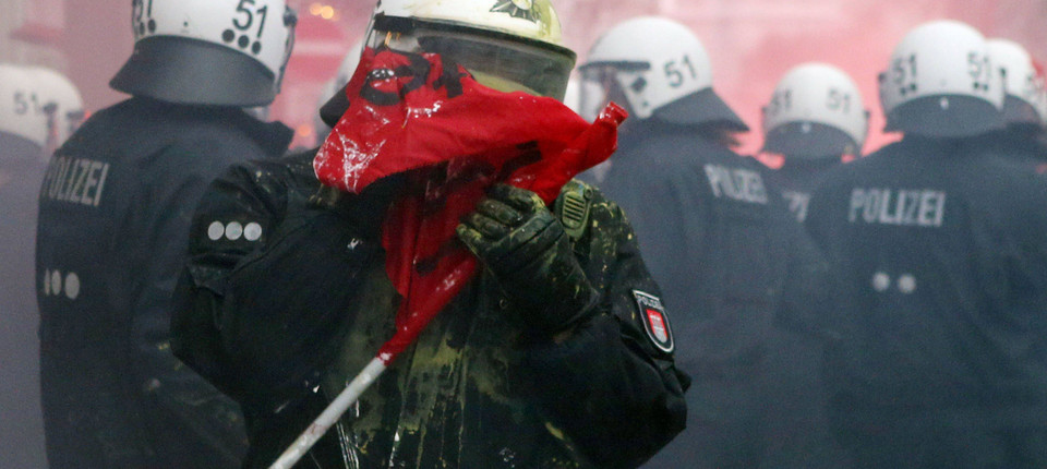 Demonstration nahe der „Roten Flora“ im Hamburg am 21. Dezember: Ein Polizeibeamter wischt sich mit einer sichergestellten Fahne der Demonstranten Farbe vom Helm Bild: dpa