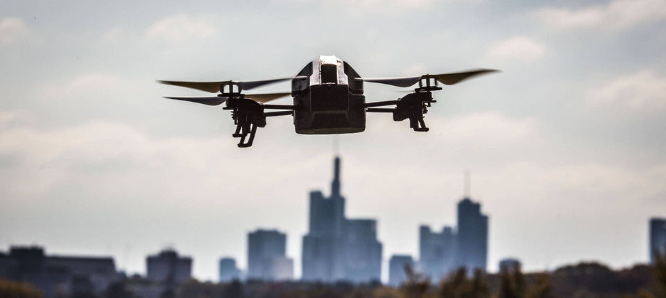 Wendig, schlau und alles im Blick: Ein Multikopter vor Frankfurts Skyline, aber außerhalb der Flugverbotszone. Bild: dpa