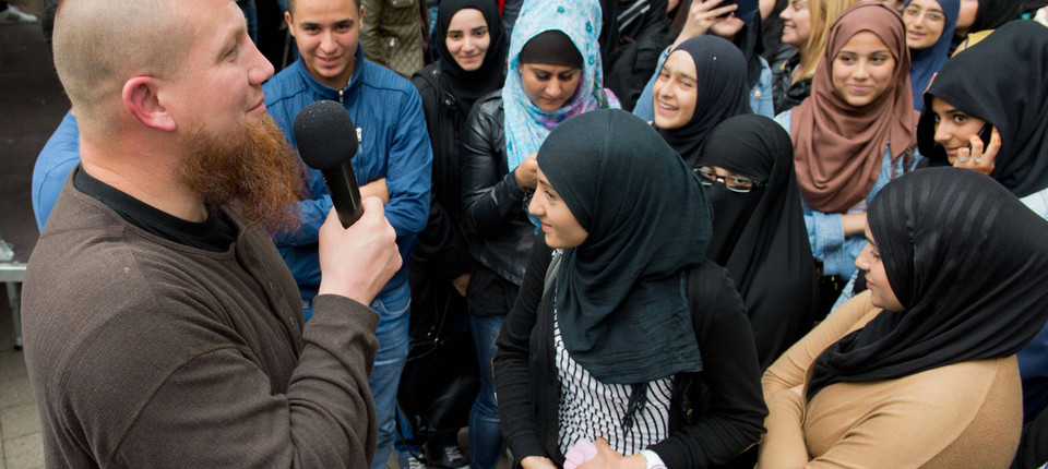 Am Ende der mehr als eineinhalbstündigen Rede von Pierre Vogel lichten sich die Reihen deutlich, die Zahl der Zuhörer hat sich halbiert. Schnell ruft der Prediger alle auf die Bühne, die zum Islam konvertieren wollen. Ein junger Mann tritt hervor, später gesellt sich noch eine Frau hinzu.