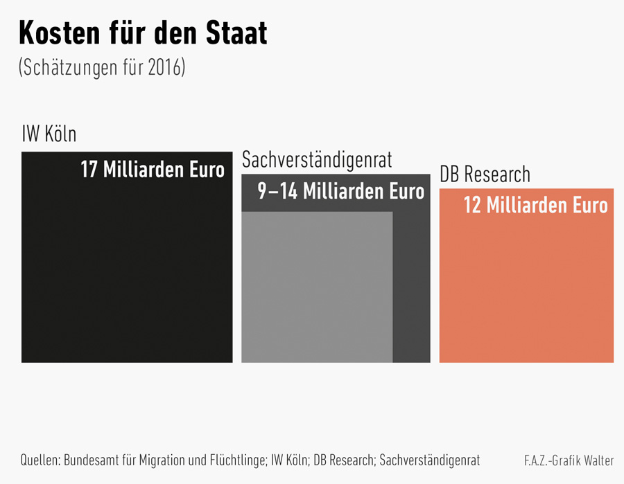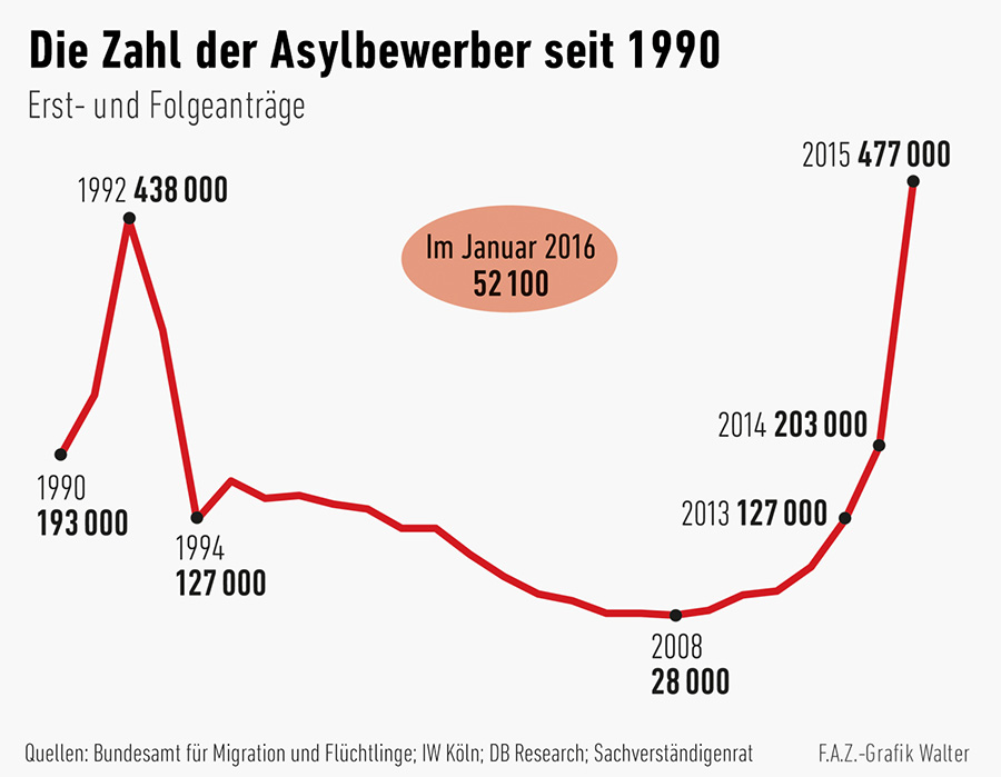 Insgesamt kommt da ordentlich etwas auf die Steuerzahler zu. Die Schätzungen über die Kosten für das Jahr 2016 gehen weit auseinander. Während die Deutsche Bank mit 12 Milliarden Euro rechnet, prognostizierte das Institut der deutschen Wirtschaft Köln vor wenigen Tagen schon 22 Milliarden Euro. Das sorgt dafür, dass sich ganz schön was tut in Deutschland. Mehr als eine Million Flüchtlinge sind im vergangenen Jahr gekommen. Knapp die Hälfte davon hat bislang offiziell Asyl beantragt. Und schon das sind mehr als im bisherigen Rekordjahr 1992. In Windeseile hat insbesondere die Wohlfahrtsindustrie darauf reagiert. Verbände von Caritas bis Rotes Kreuz sind aktiv, wenn es darum geht, Flüchtlingsheime zu betreiben oder Räumlichkeiten für Notunterkünfte umzurüsten. Sie bieten Sanitätsdienste und Sozialberatung für die Migranten.