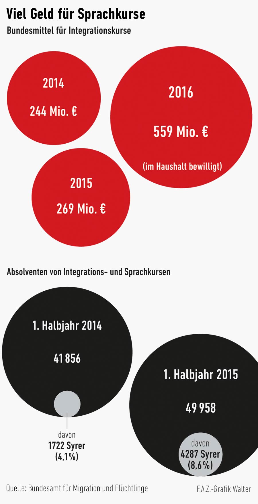 Transparenter ist ein Teil des Flüchtlings-Business, der gerade erst so richtig anläuft: die Sprachkurse. Im Jahr 2014 hat das Bundesamt für Migration und Flüchtlinge (Bamf) 244 Millionen Euro für die Finanzierung von Deutsch-Integrationskursen ausgegeben. 2015 waren es 269 Millionen. Jetzt soll sich dieser Betrag beinahe verdoppeln: Im Haushalt für 2016 sind 559 Millionen vorgesehen. Hinzu kommen zusätzliche Gelder von der EU und unzählige Einzelinitiativen.