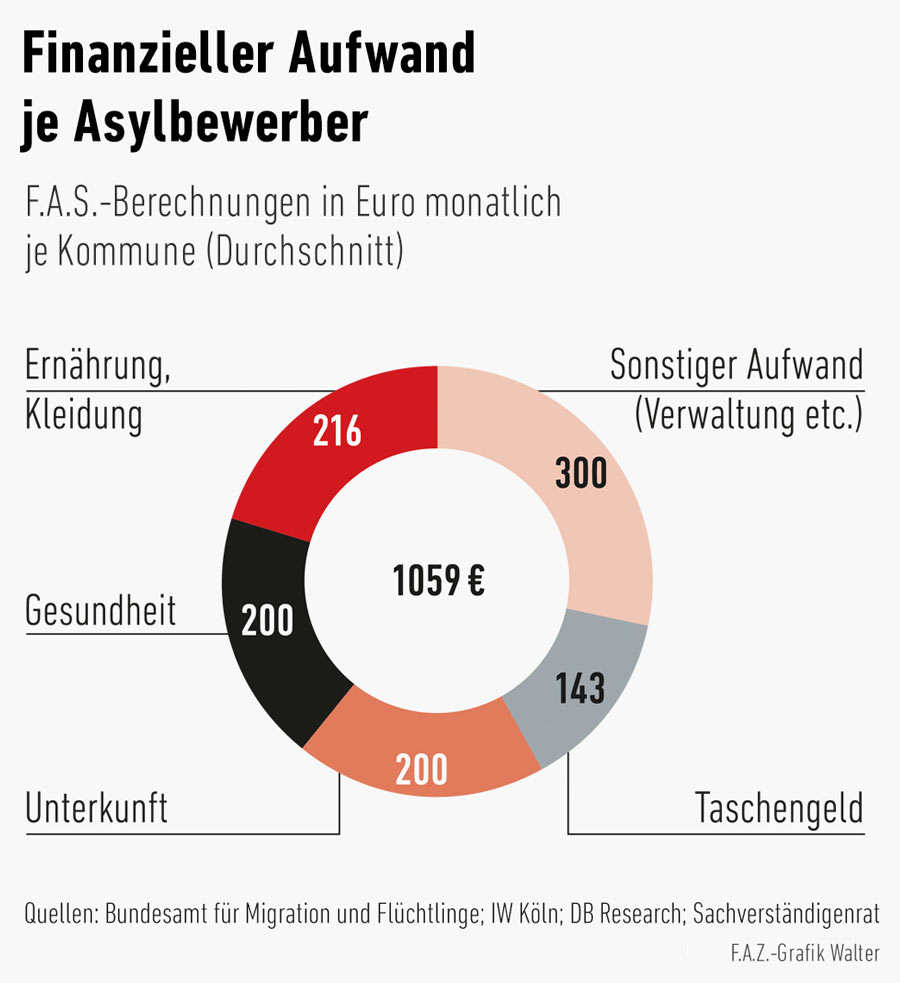 Schon jetzt ist die Gesundheit neben der Unterkunft einer der größten Kostentreiber in der Rechnung der Kommunen. Schaut man sich Beispielrechnungen an, dann geben die Städte und Gemeinden insgesamt monatlich rund 1059 Euro je Asylbewerber aus. Davon rund 200 Euro für die Gesundheit, genauso viel wie für die Unterkunft. Dazu kommen 143 Euro Taschengeld, 216 Euro für Ernährung und Kleidung sowie 300 Euro für Sonstiges, darunter die Verwaltung. Sprachkurse sind hier nicht enthalten, da sie größtenteils vom Bund gezahlt werden.