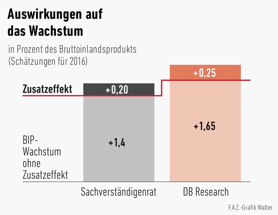 Ökonomen rechnen gerne vor, dass die staatlichen Ausgaben für Flüchtlinge in diesem Jahr wie ein kleines Konjunkturpaket wirken werden. Der Sachverständigenrat für Wirtschaft etwa rechnet damit, dass das Wirtschaftswachstum 2016 um 0,2 Prozentpunkte höher ausfällt, als das ohne Flüchtlinge der Fall wäre. Statt um 1,4 Prozent wächst die deutsche Wirtschaft demnach um 1,6 Prozent. Die Deutsche Bank rechnet sogar mit einem noch etwas stärkeren Plus.