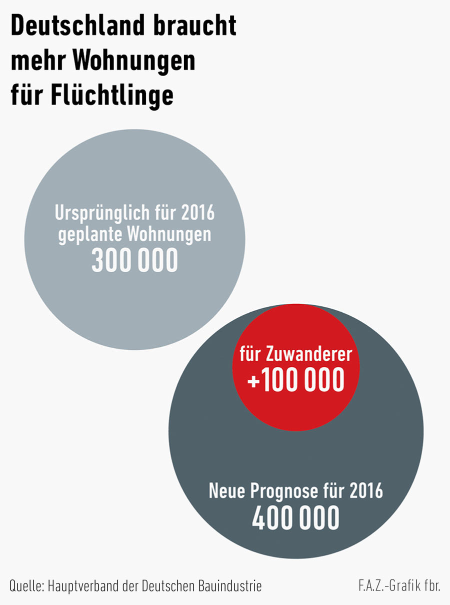 Und schließlich werden diejenigen einen Schub erleben, die es immer braucht, wenn es mehr Leute im Land gibt: die Baufirmen. Zuletzt ohnehin schon im Aufschwung, hofft der Bau nun auf ein großes Geschäft. Im vorigen Jahr haben Bauunternehmen bundesweit 265.000 Wohnungen fertiggestellt, davon knapp die Hälfte in Mehrfamilienhäusern. Für 2016 rechnete die Branche ursprünglich mit 300.000 neuen Einheiten. Jetzt hat sie die Zahl auf 400.000 korrigiert. „Der Zusatzbedarf von 100.000 Wohnungen zielt in erster Linie auf die Unterbringung von Zuwanderern ab“, erklärt der Bundesverband der Bauindustrie.