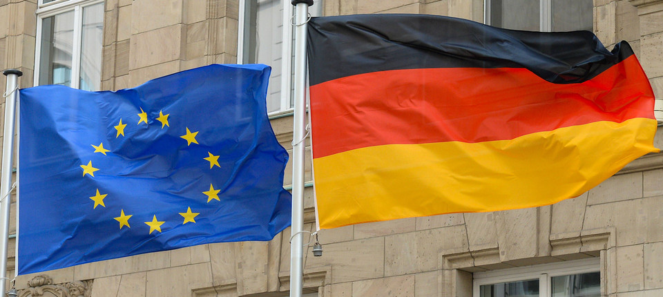 Vor dem Gebäude der Landesvertretung des Freistaates Sachsen in Berlin wehen eine Europafahne und eine Deutschlandfahne. Bild: dpa