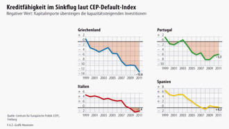 Hinweise darauf liefert der Schuldenindex des CEP, den es erstmals 2011 veröffentlicht hat. Dieser umschließt private und öffentliche Schulden und besteht aus dem gesamtwirtschaftlichen Finanzierungssaldo, also dem Auslandskreditbedarf, und aus dem Niveau der kapazitätssteigernden Investitionen. Der Gedanke dahinter: Ein Land, das Kapital aus dem Ausland importiert, sollte mit diesem die Produktionskapazitäten erhöhen, um mit den Erträgen die Auslandsschulden begleichen zu können. Fällt der CEP-Default-Index unter null, übersteigen die Nettokapitalimporte die kapazitätssteigernden Investitionen. Damit konsumieren Griechenland, Italien und Portugal einen Teil des importierten Kapitals und verschulden sich dafür.