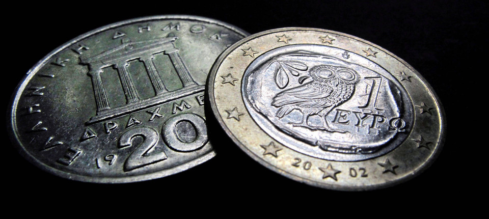 Was haben die Griechen künftig in den Taschen? 20 Drachmen der ehemaligen Währung des Landes und ein griechischer Euro Bild: dpa