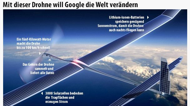 Google kauft ein Weltraumunternehmen. Eines, das Roboter erfindet, die hoch über der Erde fliegen (Drohnen). Die Internet zu den Menschen bringen, die noch nie zuvor Zugang zum Netz hatten. Und die überdies von der Sonne bestrahlt fünf Jahre unterwegs sein können sollen. Am Stück.