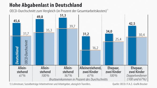 Wie die Organisation für wirtschaftliche Entwicklung und Zusammenarbeit (OECD) berichtet, ist die Abgabenlast in Deutschland zuletzt wieder gestiegen, nachdem sie vorher gefallen war. Für einen durchschnittlich verdienenden unverheirateten Angestellten ohne Kinder erhöhte sie sich 2011 um 0,6 Prozentpunkte auf 49,8 Prozent. Insgesamt kam es in sieben von acht untersuchten Haushaltstypen zu geringen Mehrbelastungen von höchstens 1,1 Prozentpunkten. Gleichwohl stiegen die Nettolöhne, weil die Tariferhöhungen die höheren Abzüge und die Inflation mehr als ausglichen.