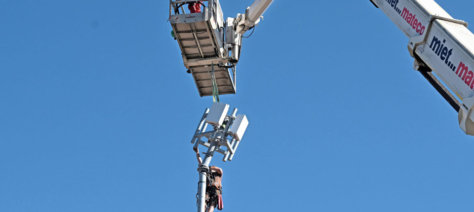 Schnelles Internet: Techniker installieren eine 5G-Mobilfunkantenne. Bild: dpa