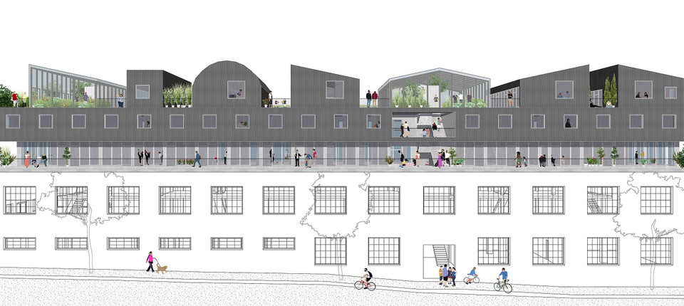 Neue Wohnungen auf alter Gewerbehalle. Bild: Visualisierung (c) TRNSFRM eG / Hütten und Paläste